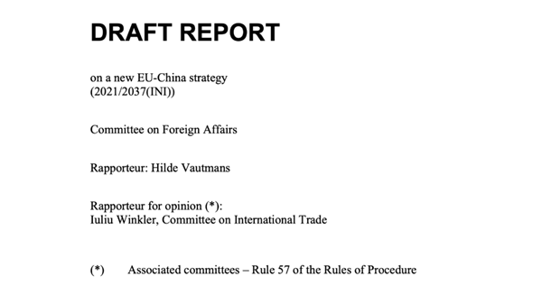 用欧洲议会外交委员会委员、“新欧中战略”报告撰稿人沃特曼斯(Hilde Vautmans)的话说,外交委员会提交“新欧中战略”报告目的是要求发展欧盟新的、更强硬(assertive)的对华关系战略。该报告认为,通过强劲的经济增长和雄心勃勃的外交政策议程,中国在经济实力和外交事务上主张更强大全球角色,这给欧盟带来“严峻”的政治、经济、安全和技术挑战、“对全球秩序影响重大,对自由民主形成威胁。”